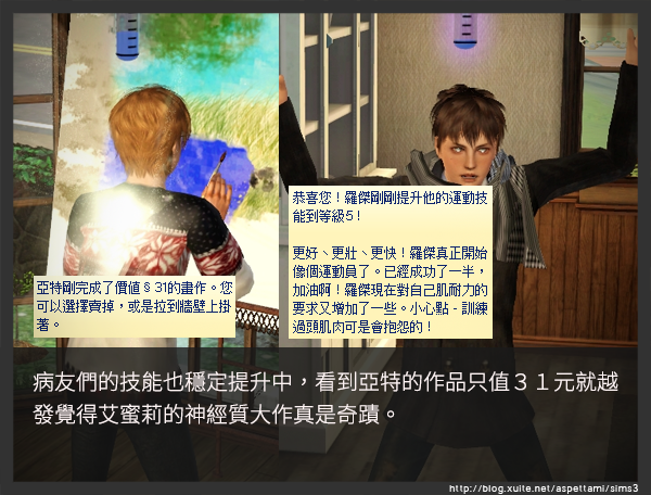 艾蜜莉:繪畫1;烹飪6;釣魚4;小提琴2;靈巧1;運動2;靈巧4;鋼琴1